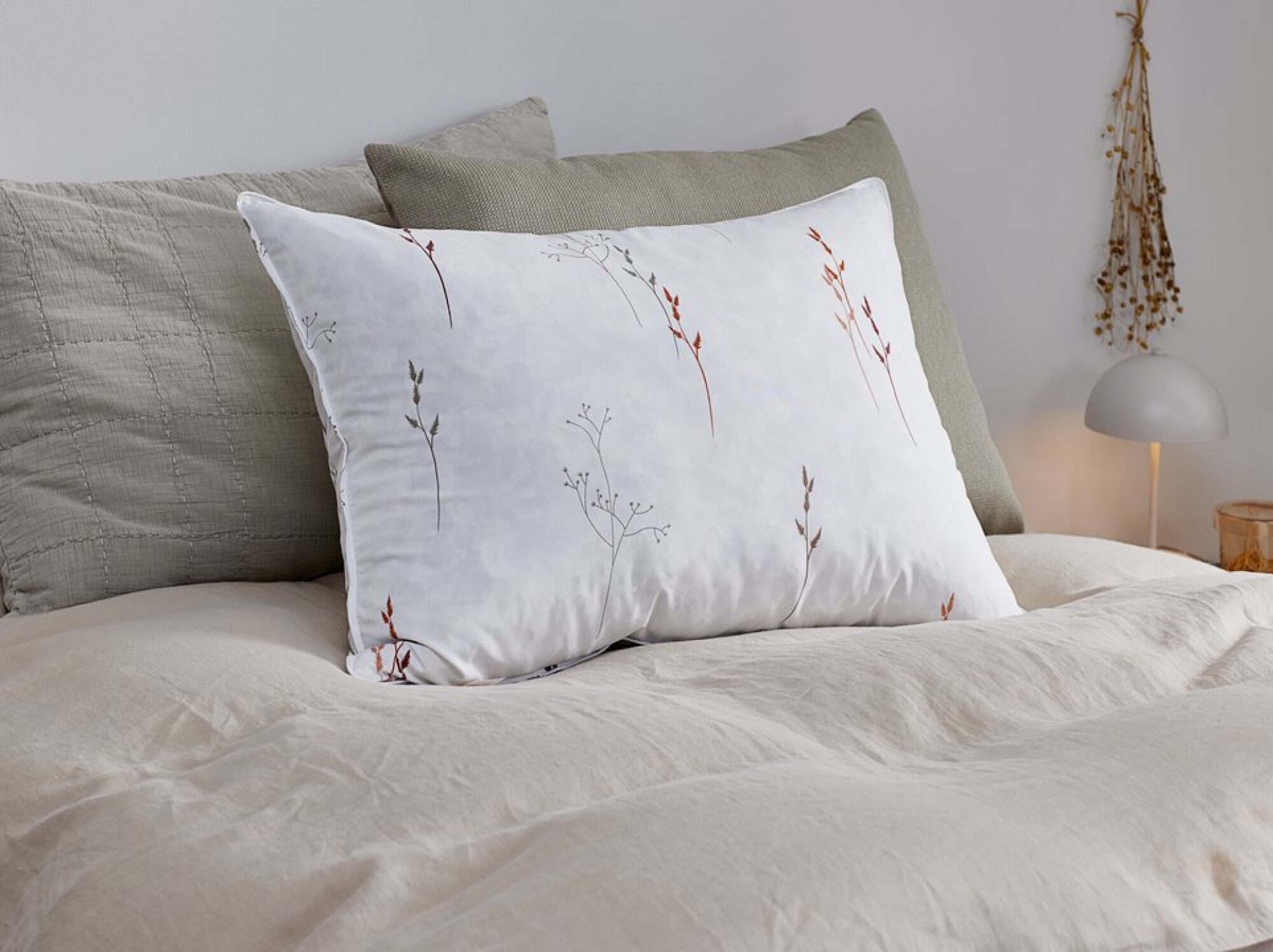 Descripción Almohada, relleno 100% plumas de pato 1050 g, funda microfibra 100% poliéster, fill power 125, lavable 40°C, 50x70 cm